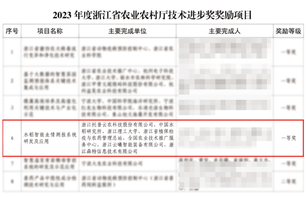 近日,加快建設(shè)創(chuàng)新浙江因地制宜發(fā)展新質(zhì)生產(chǎn)力動(dòng)員部署會(huì)暨全省科學(xué)技術(shù)獎(jiǎng)勵(lì)大會(huì)在杭州舉行。大會(huì)公布并表彰了2023年度浙江省科學(xué)技術(shù)獎(jiǎng)。其中,由浙江托普云農(nóng)科技股份有限公司(股票簡稱:托普云農(nóng),股票代碼:301556)牽頭完成的《水稻智能蟲情測(cè)報(bào)系統(tǒng)研發(fā)及應(yīng)用》成果榮獲2023年度浙江省科學(xué)技術(shù)進(jìn)步獎(jiǎng)三等獎(jiǎng)。這是該項(xiàng)成果繼榮獲“2023年度浙江省農(nóng)業(yè)農(nóng)村廳技術(shù)進(jìn)步獎(jiǎng)一等獎(jiǎng)”之后斬獲的第二個(gè)重磅獎(jiǎng)項(xiàng),充分展現(xiàn)了托普云農(nóng)在農(nóng)業(yè)科技創(chuàng)新領(lǐng)域的卓越實(shí)力。